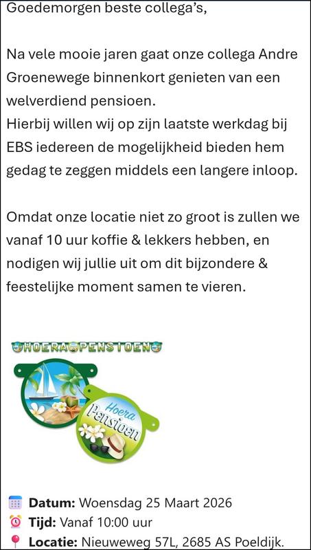 | Afscheid van collega's, meestal met pensioen maar niet allemaal |